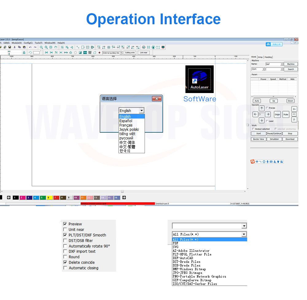 10. Support track preview, continuous engraving after power-off, real-time correction of power light intensity and speed during work, rotary engraving, switchingof 2 platforms, split feeding, pressure feeding, automatic blowing, auto focus, foot switch, safety protection, upgrade, processing statistics information and other functions;