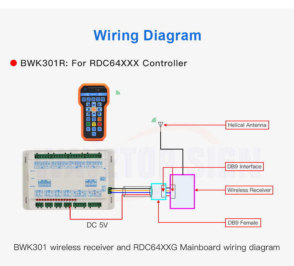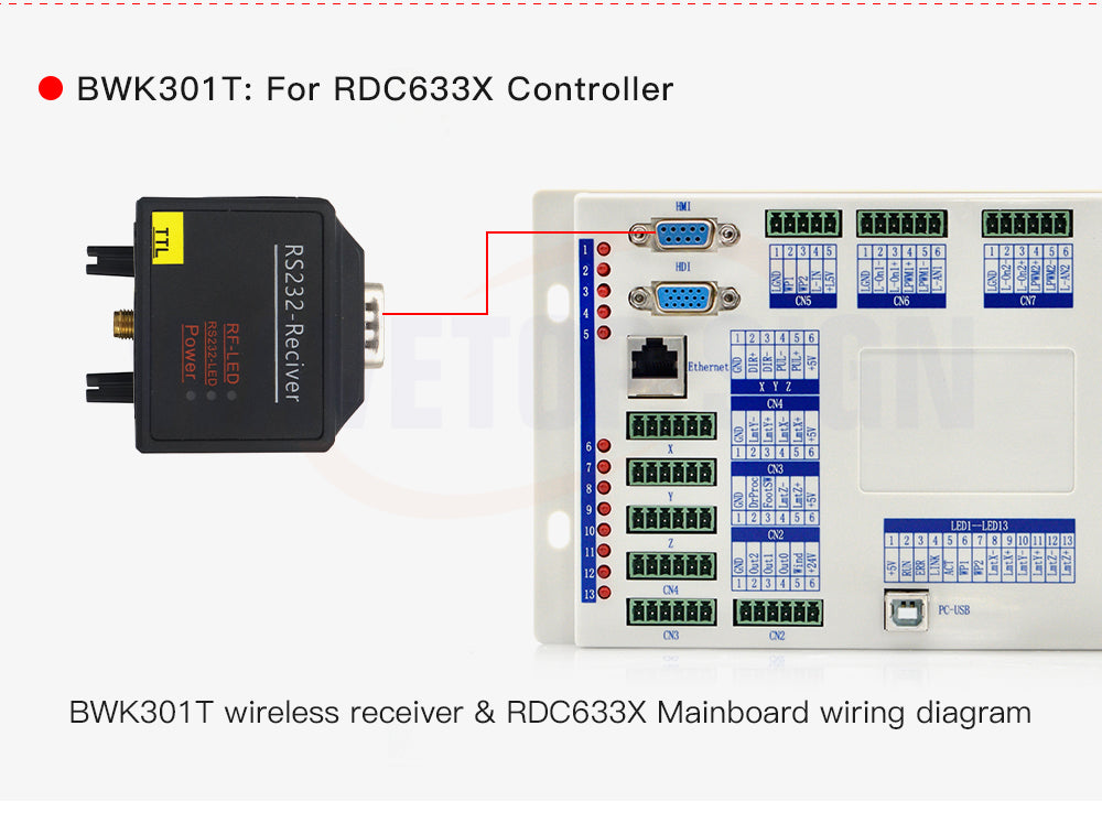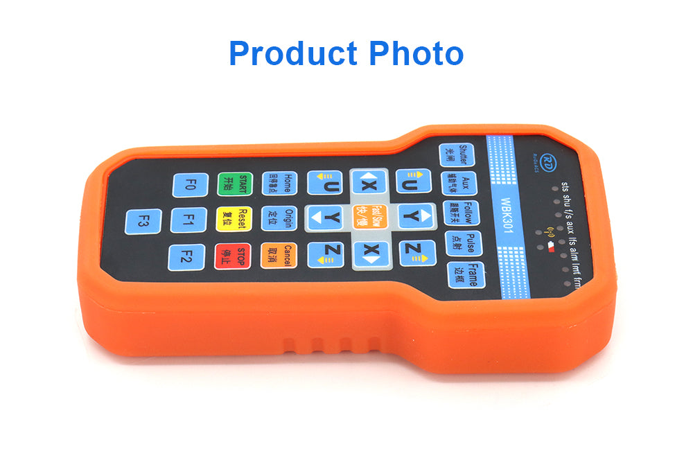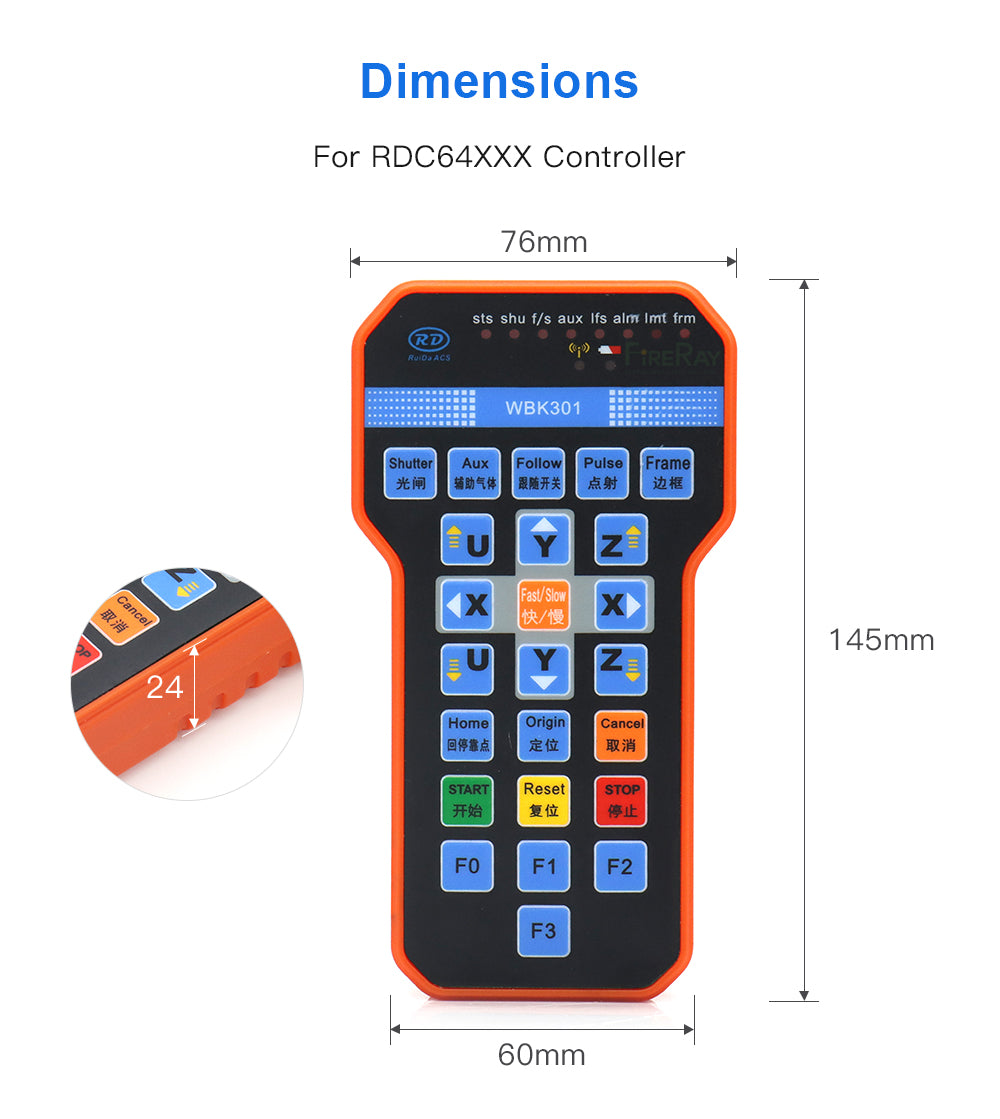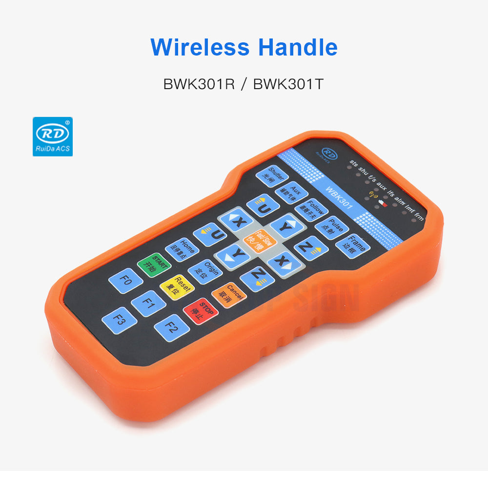 The wireless operating panel BWK301R consists of two parts: wireless panel and wireless receiver. Wireless panel and wireless adapter communication, wireless receiver connection to RD motion controller, user can control the cutting process reliable within a certain range (10-40m) through the wireless panel, easy to operate. The system allows the user can control the system real time in the production pricess, improving the working efficiency and easy to use and reliable. Parallel working with controller operaion panel, there is no interference with each other. Wireless controller BWK301 only supports communication with RDC64XXG mother-board.